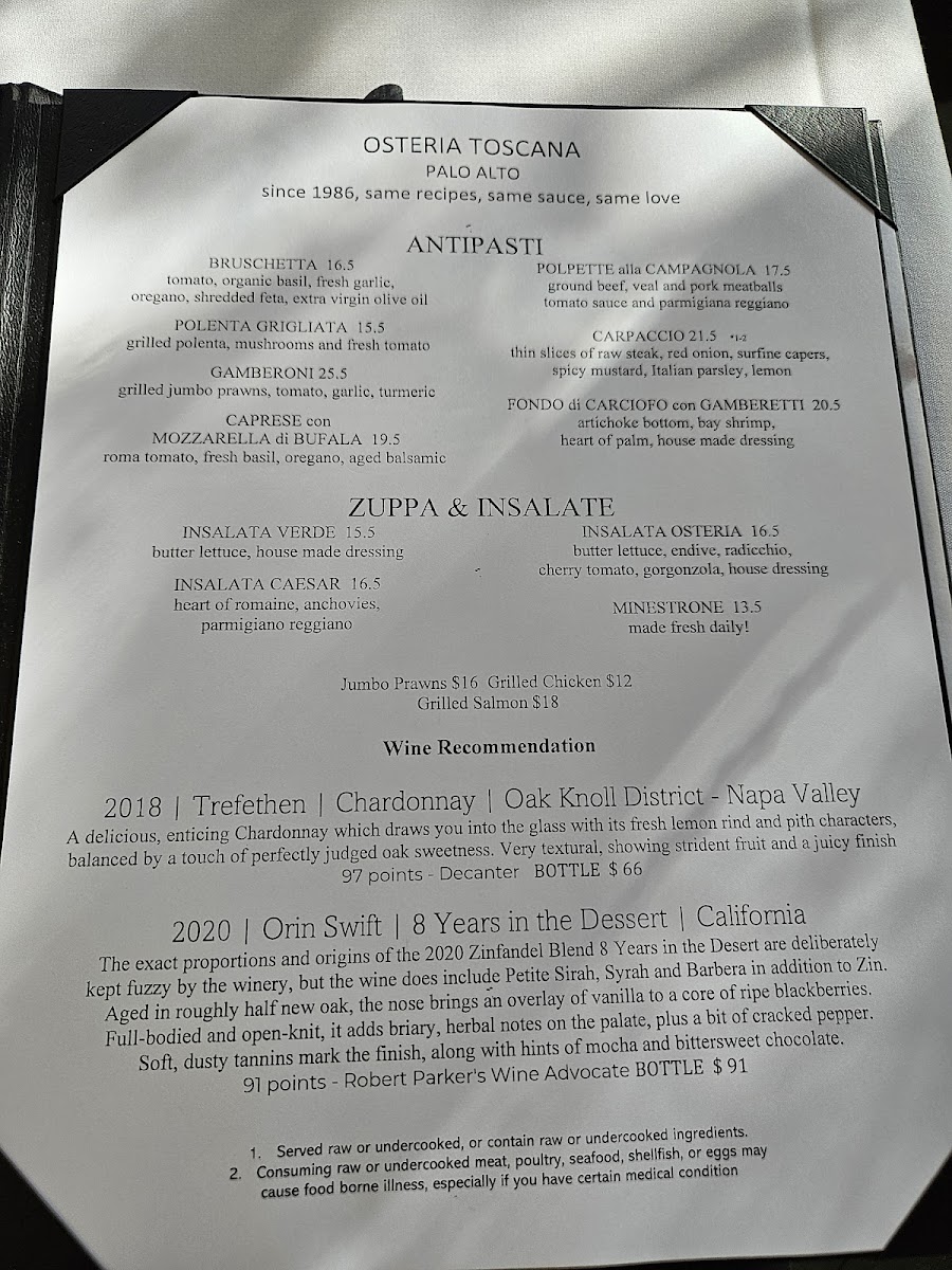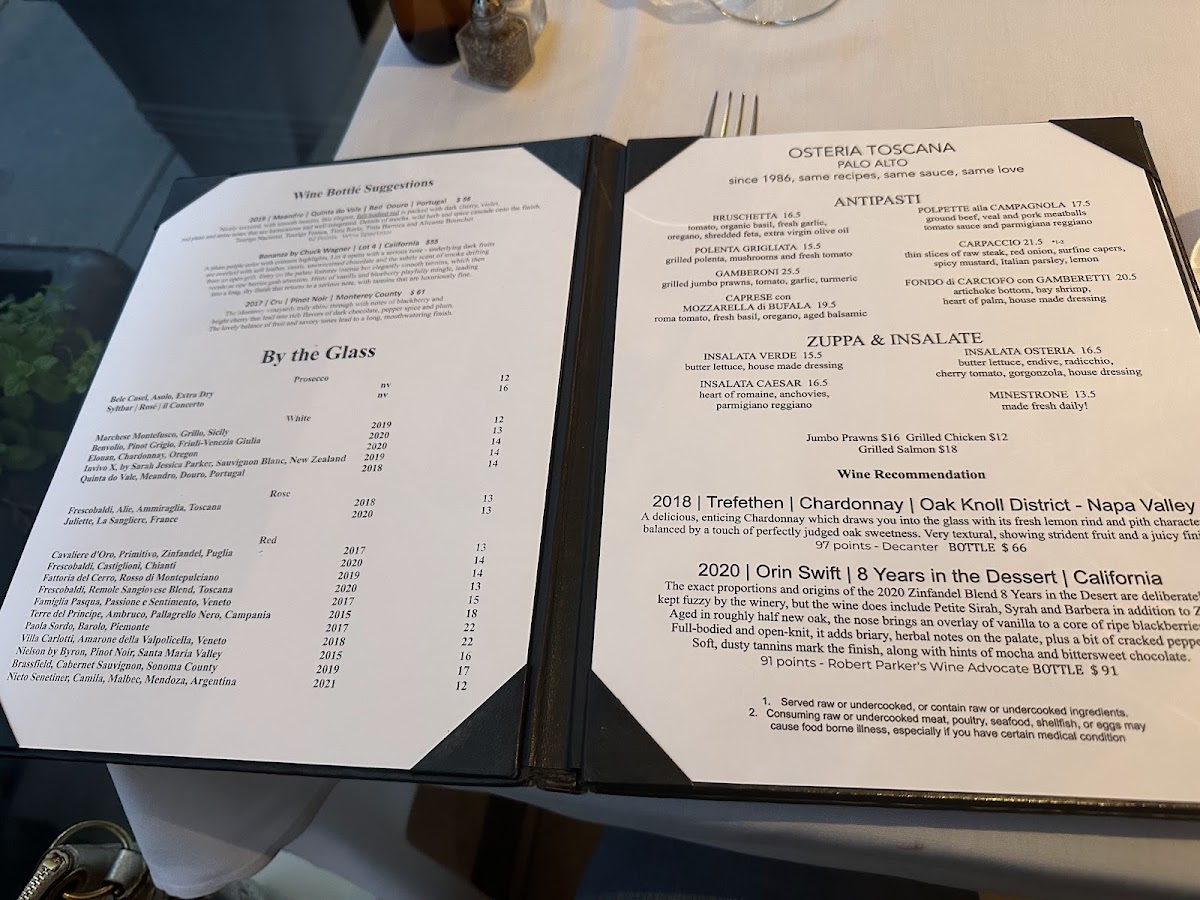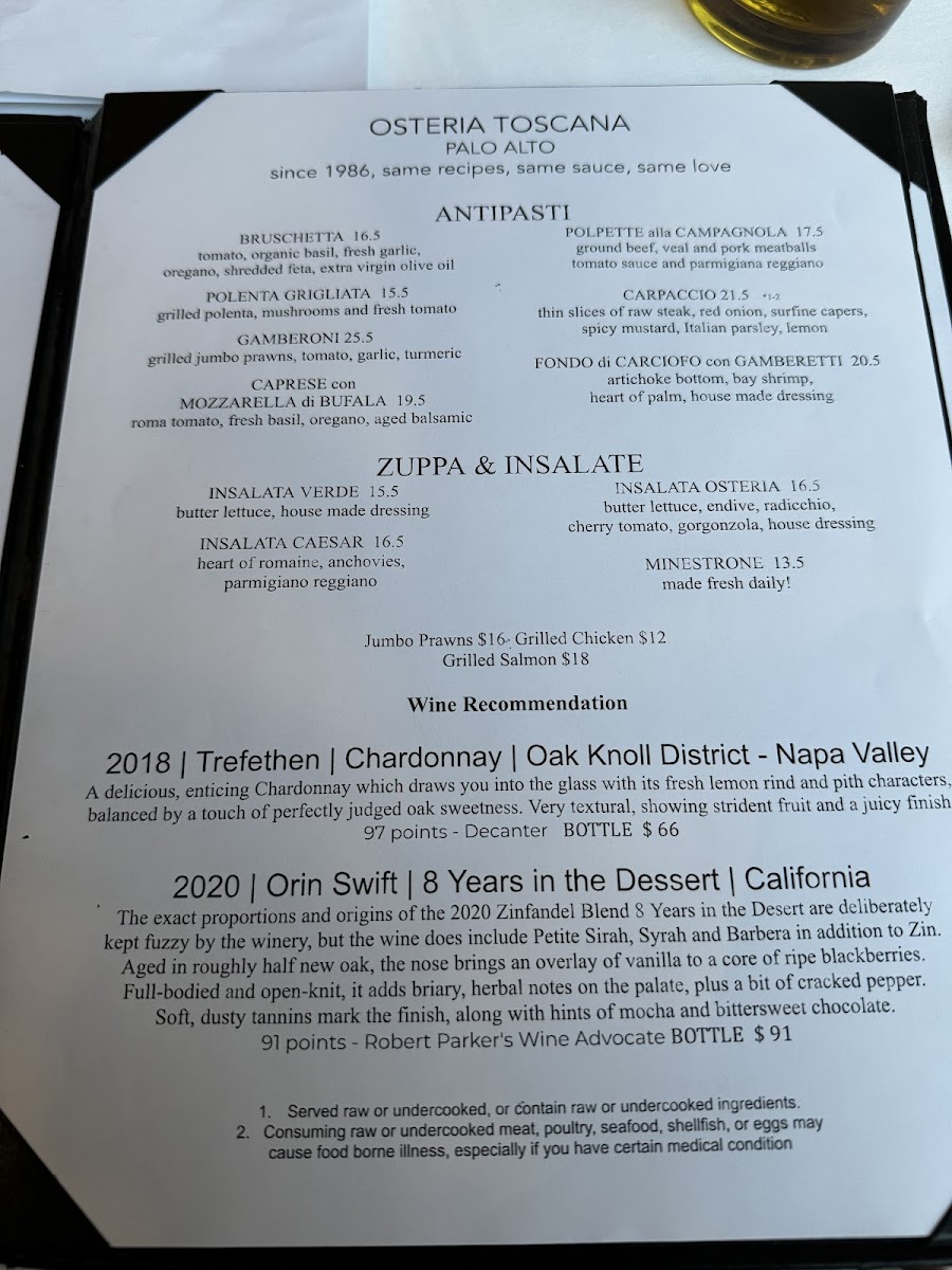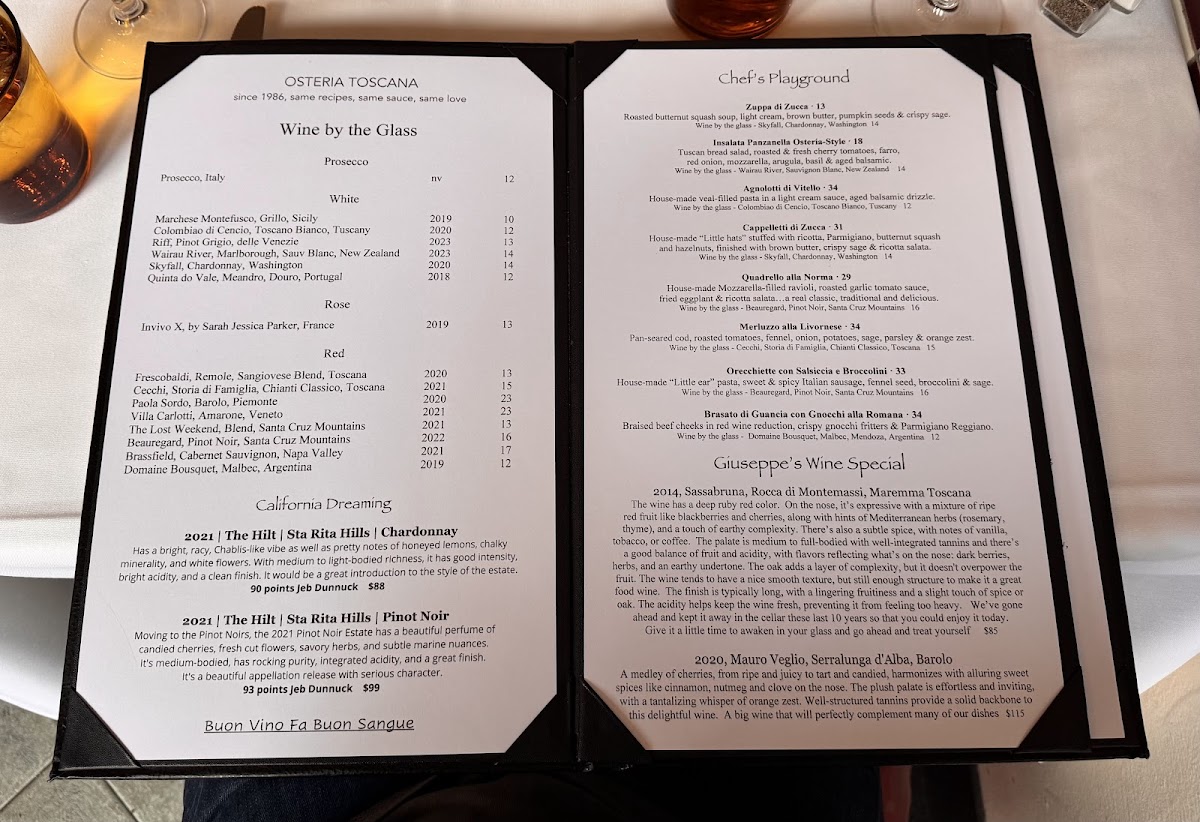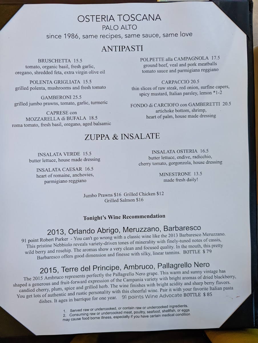 The menu at Osteria Toscana features a broad selection of traditional Italian dishes organized into several categories. Guests can start with a variety of salads and soups listed under Zuppa & Insalate, including options such as Insalata Verde, Caesar salad, and Minestrone soup, emphasizing fresh ingredients and classic preparations.