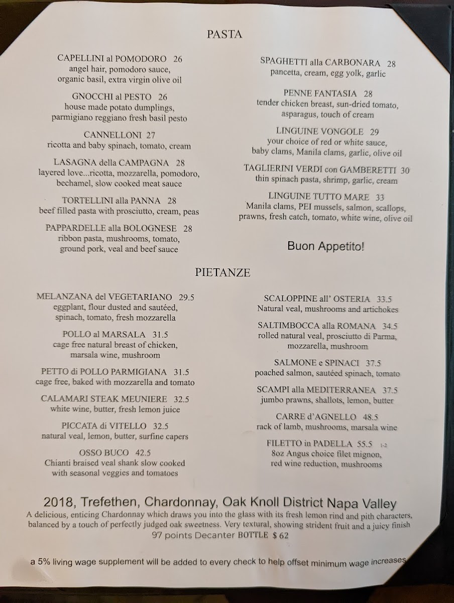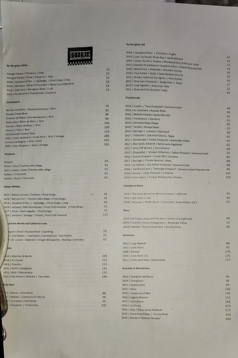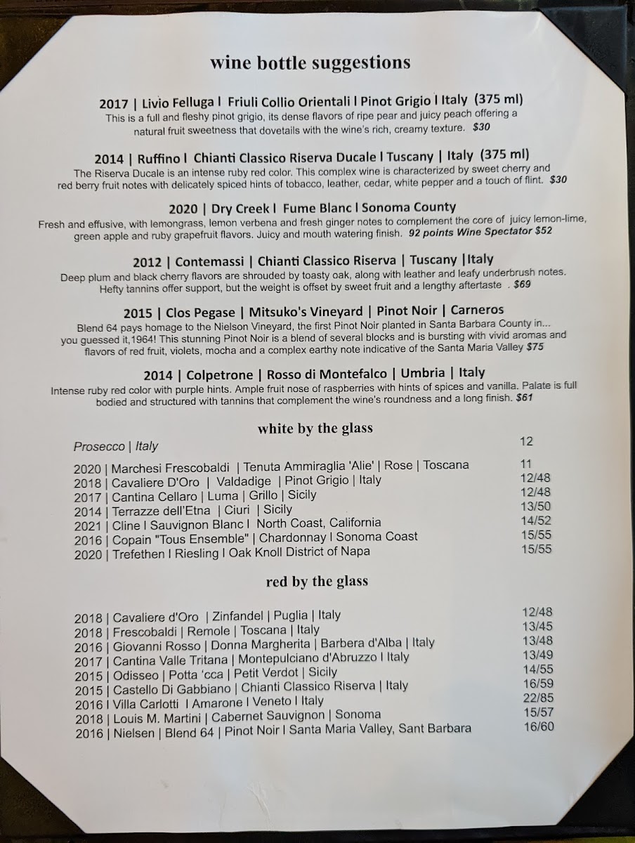 The menu also features a selection of desserts including Tiramisu and Lava Cake, providing sweet finishes typical of Italian dining. Complementing the food are curated wine choices, such as a 2010 Sangiovese Riserva from Tuscany and lighter options like Pinot Grigio and Rosé, which are recommended to pair with different dishes.